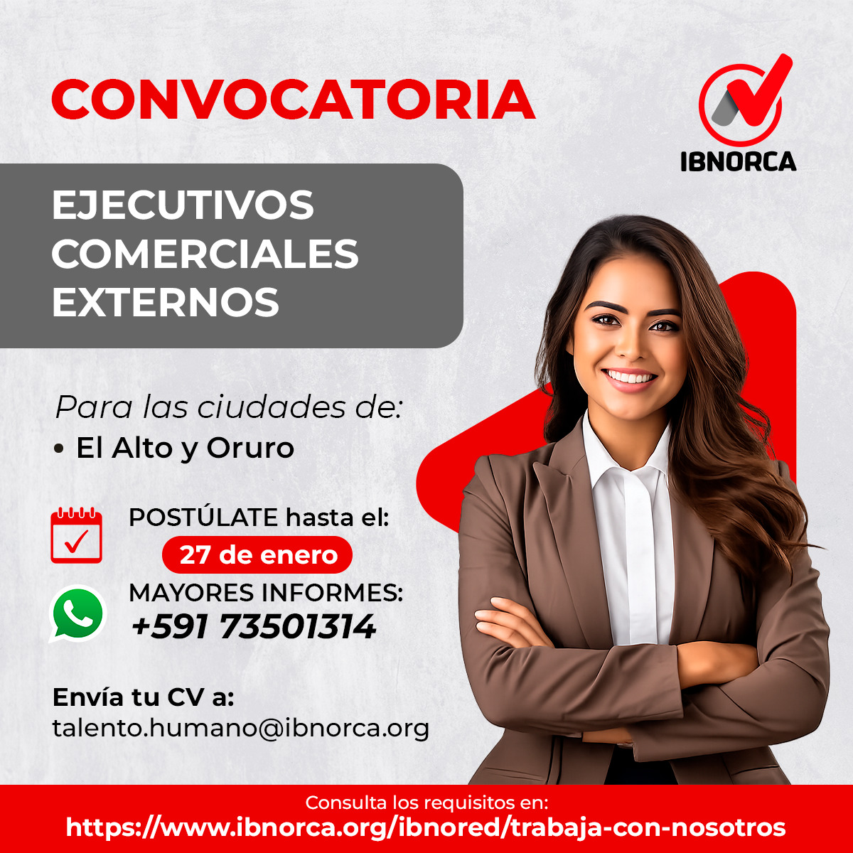 IBNORCA apertura convocatoria: Ejecutivo Comercial Externo para las ciudades de El Alto y Oruro.