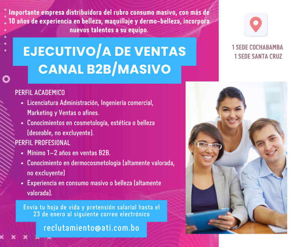 ¡BUSCAMOS EJECUTIVO/A DE VENTAS CANAL B2B/MASIVO!