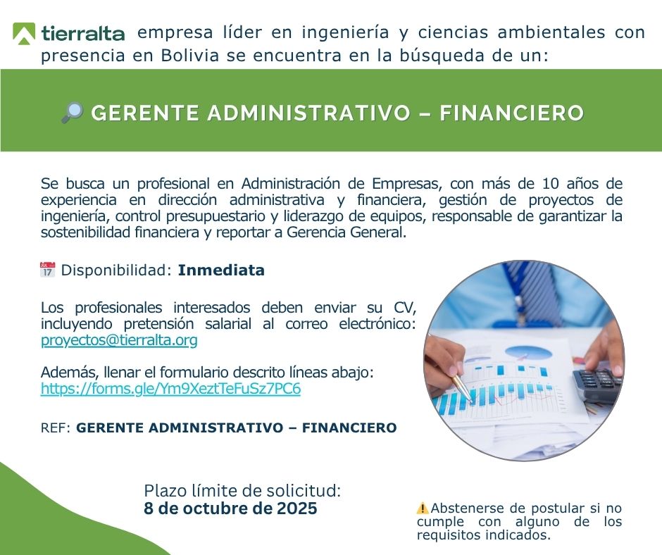 📩 Fecha límite de postulación: 8 de octubre de 2025. Enviar CV actualizado y pretensión salarial al correo: proyectos@tierralta.org, indicando en el asunto: “GERENTE ADMINISTRATIVO – FINANCIERO”.