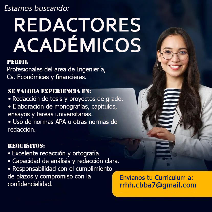 Buscamos profesionales del área de Ingenierías y Cs. Económicas y financieras con experiencia en la elaboración de trabajos universitarios: monografías, tesis, proyectos y ensayos.
