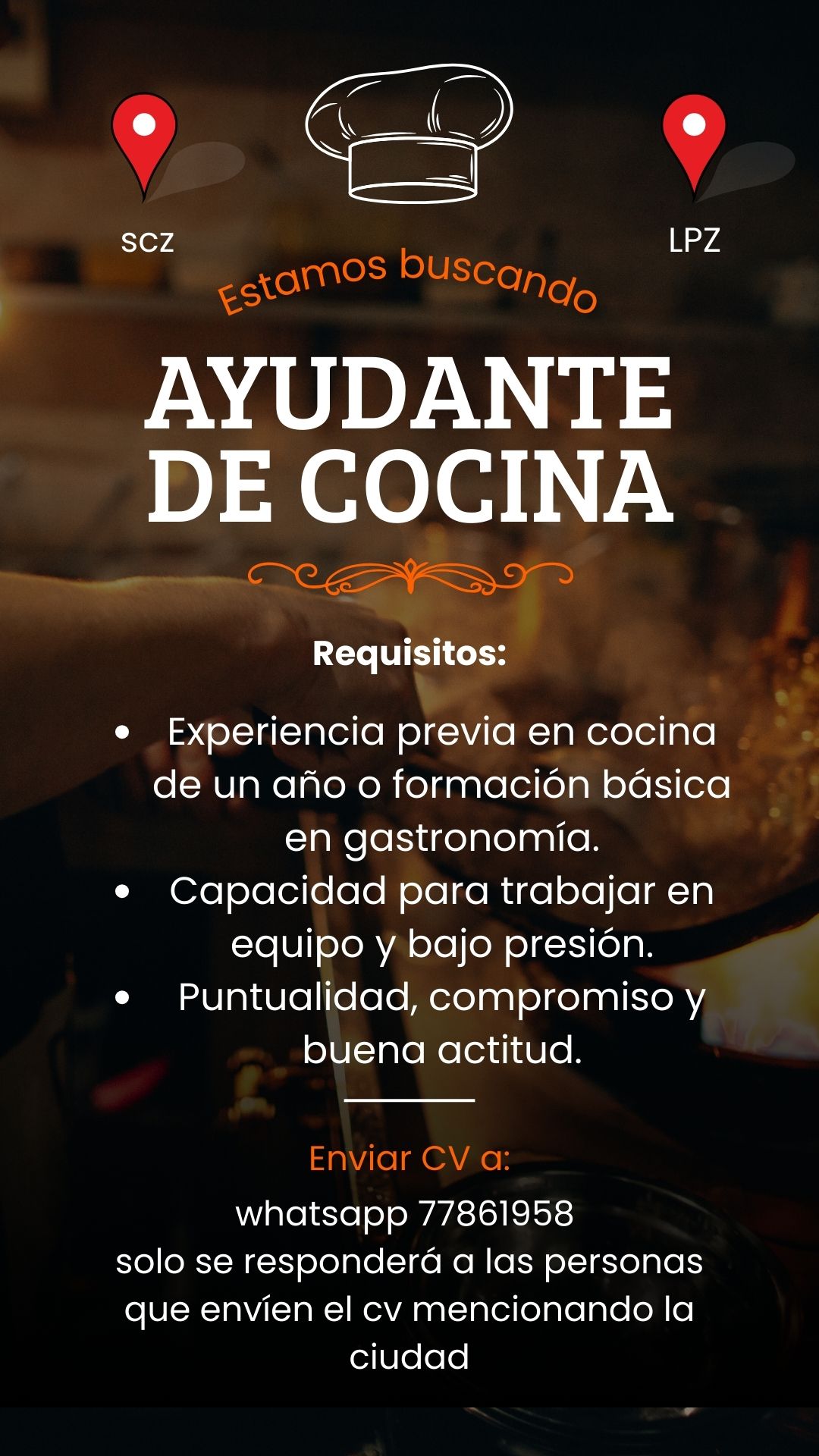 - Experiencia previa en cocina o formación básica en gastronomía (deseable).