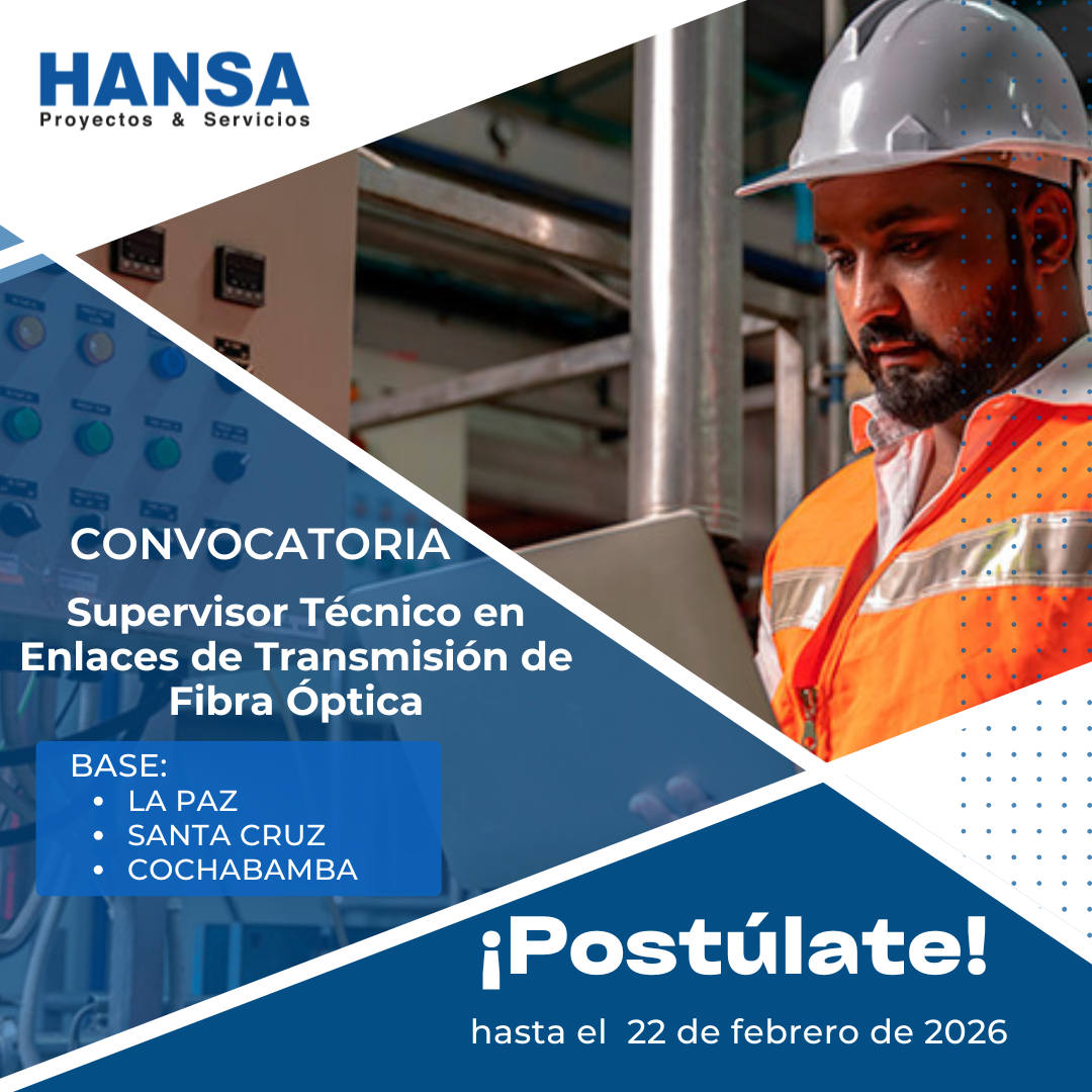 La División Proyectos & Servicios de HANSA LTDA. se encuentra en la búsqueda de un Supervisor Técnico en Enlaces de Transmisión de Fibra Óptica, con base en la ciudad de La Paz, Cochabamba y Santa Cruz para incorporarse a proyectos de fibra óptica, enlaces rollout y enlaces B2B.