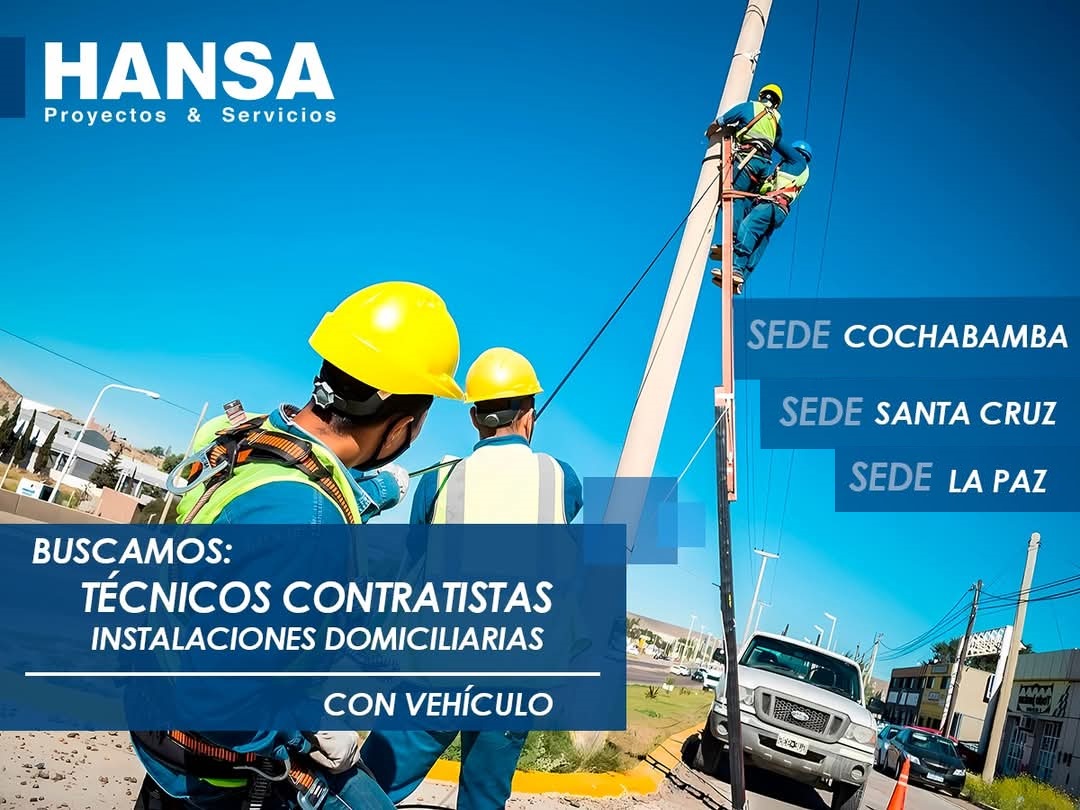 La Divisi贸n Proyectos & Servicios de HANSA LTDA. Busca personal Contratistas en instalaciones Domiciliarias con sede en la ciudad de Cochabamba, Santa Cruz y La Paz.
