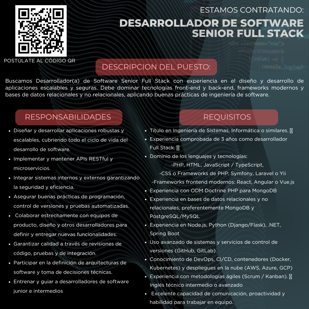 Buscamos un(a) Desarrollador(a) Full Stack altamente motivado(a) y con visión innovadora, para unirse a nuestro equipo de tecnología en la ciudad de Sucre.