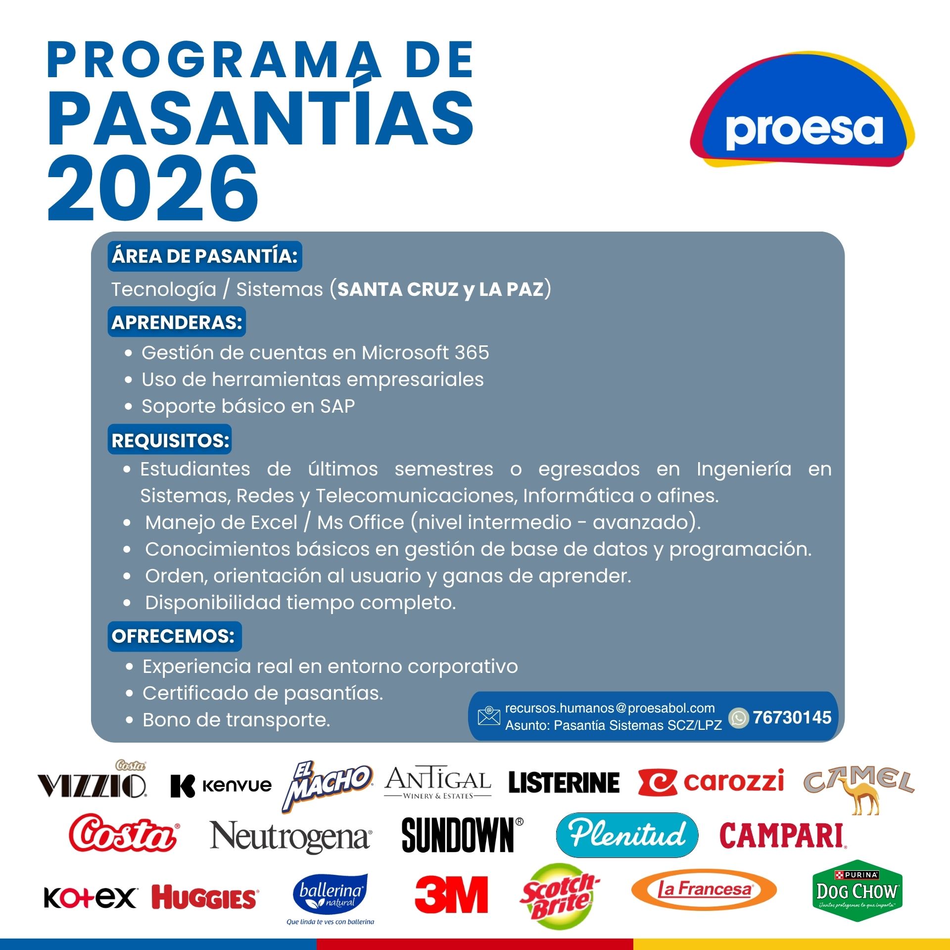 En PROESA abrimos nuestra convocatoria de PASANTIAS EN SISTEMAS (SANTA CRUZ y LA PAZ).