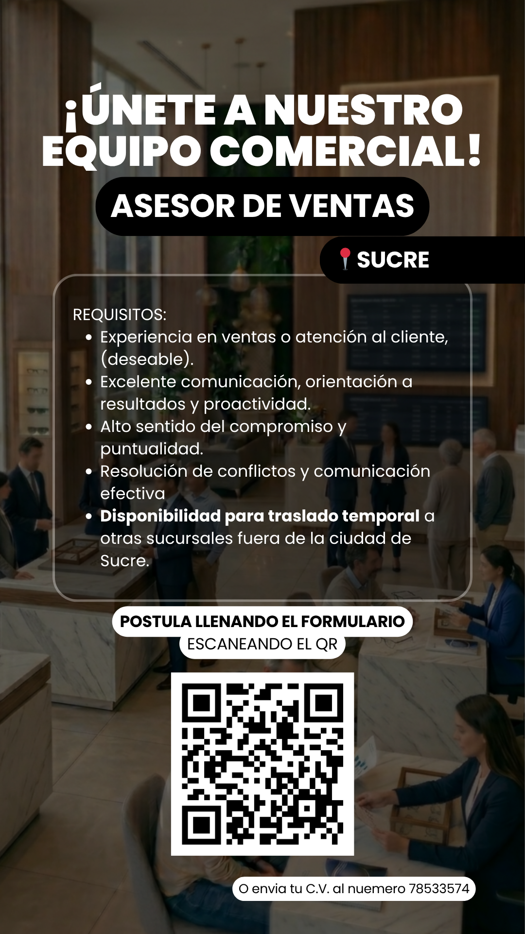 - Movilidad: Disponibilidad para traslado temporal a otras sucursales fuera de la ciudad de Sucre en caso de requerirse cobertura de vacantes urgentes.