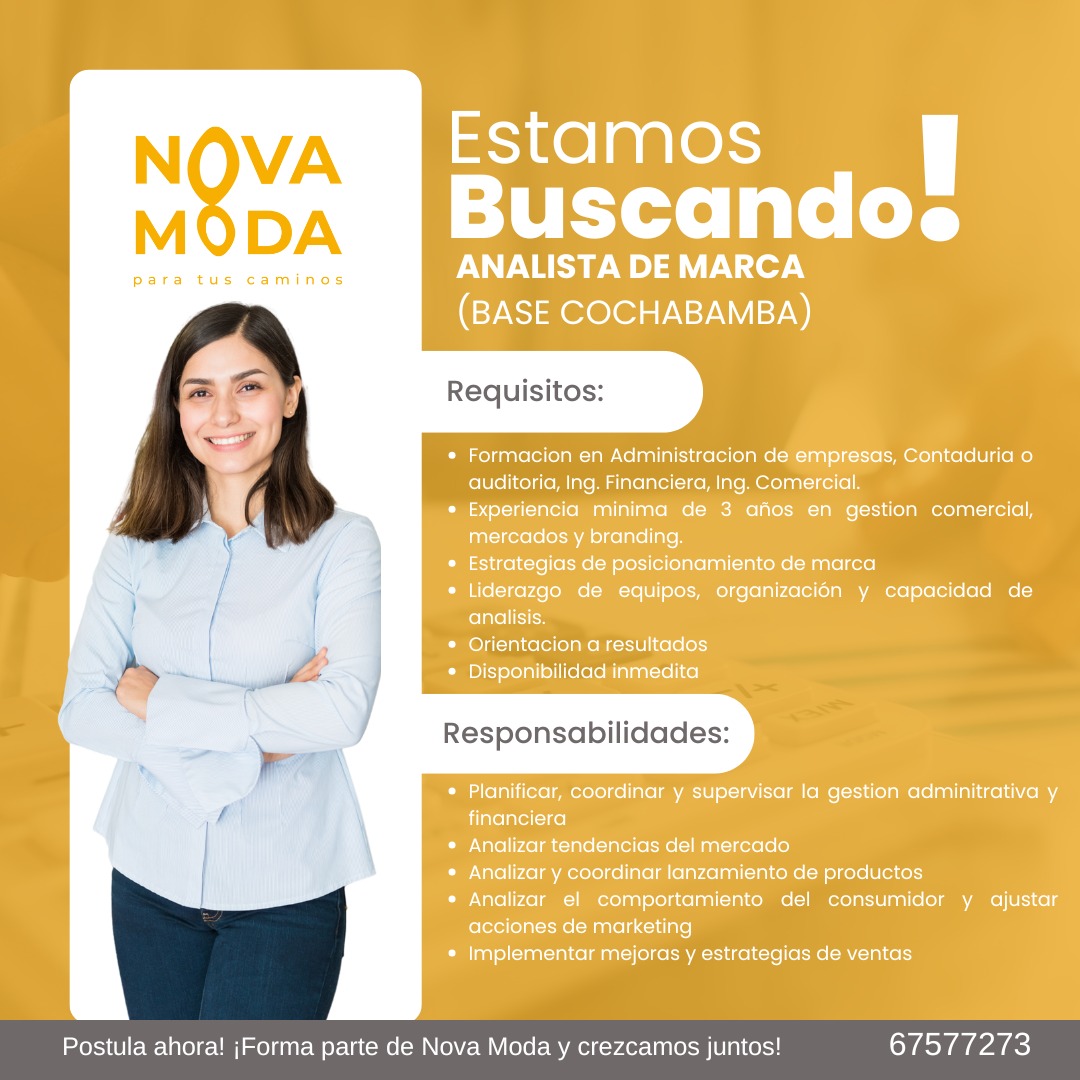 ¡Únete a nuestro equipo!Nova Moda está en busca de una Analista de marca para gestionar y optimizar nuestros procesosadministrativos. Postula ahora! Envíanos tu CV a 67577273¡Sé parte de Nova Moda y crezcamos juntos!