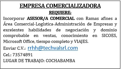 Cochabamba · Comercial y Ventas · Jornada completa VIGENTE