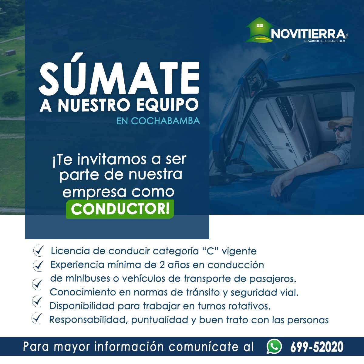 Se requiere conductor con experiencia en transporte de personal para rubro inmobiliario y licencia de conducir categoría C.