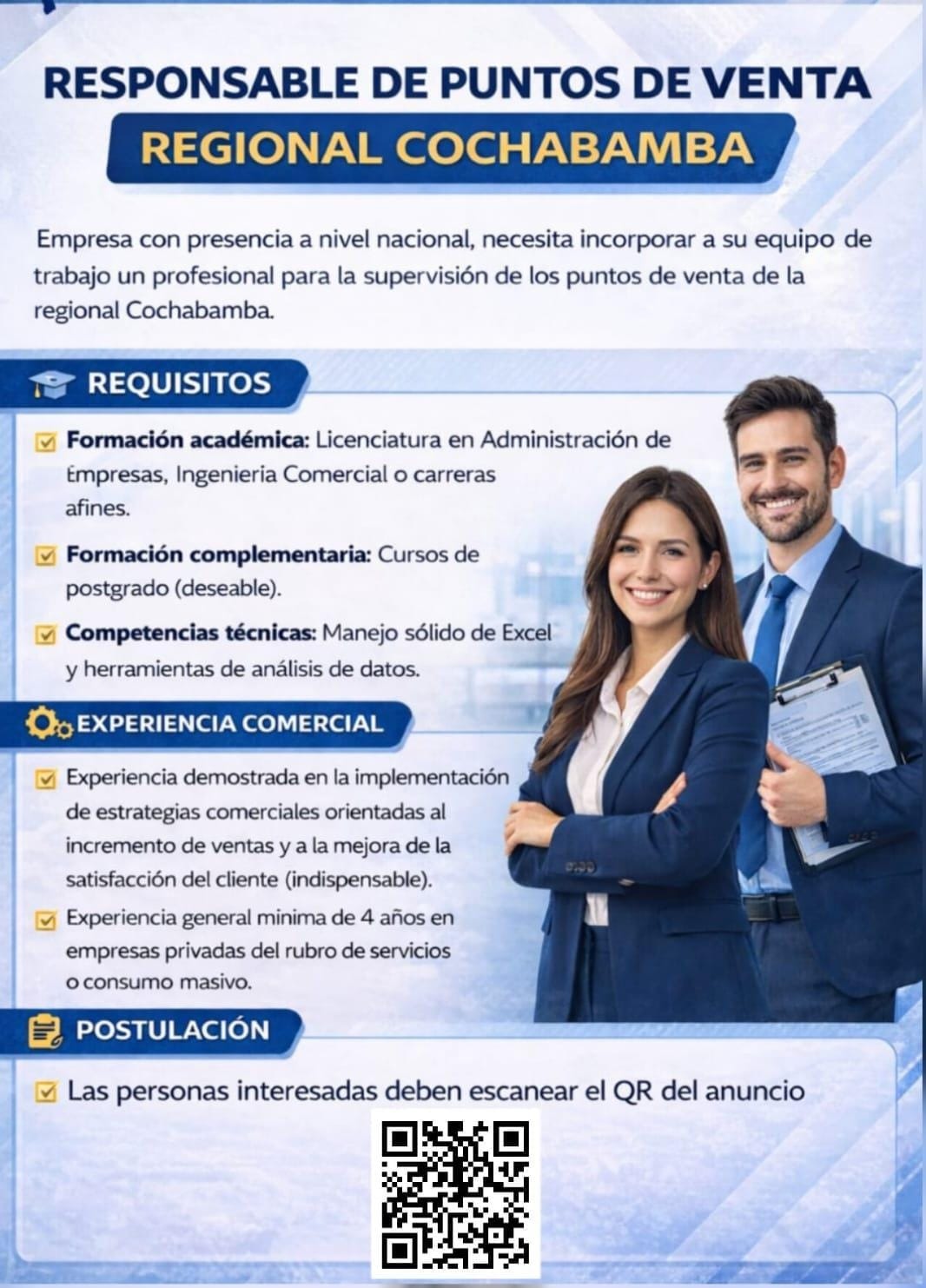 Empresa con presencia a nivel nacional, necesita incorporar a su equipo de trabajo un profesional para la supervisión de los puntos de venta de la regional Cochabamba.