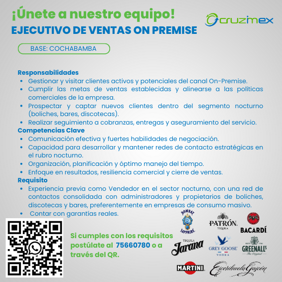 - Experiencia previa como Vendedor en el sector nocturno, con una red de contactos consolidada con administradores y propietarios de boliches, discotecas y bares, preferentemente en empresas de consumo masivo.