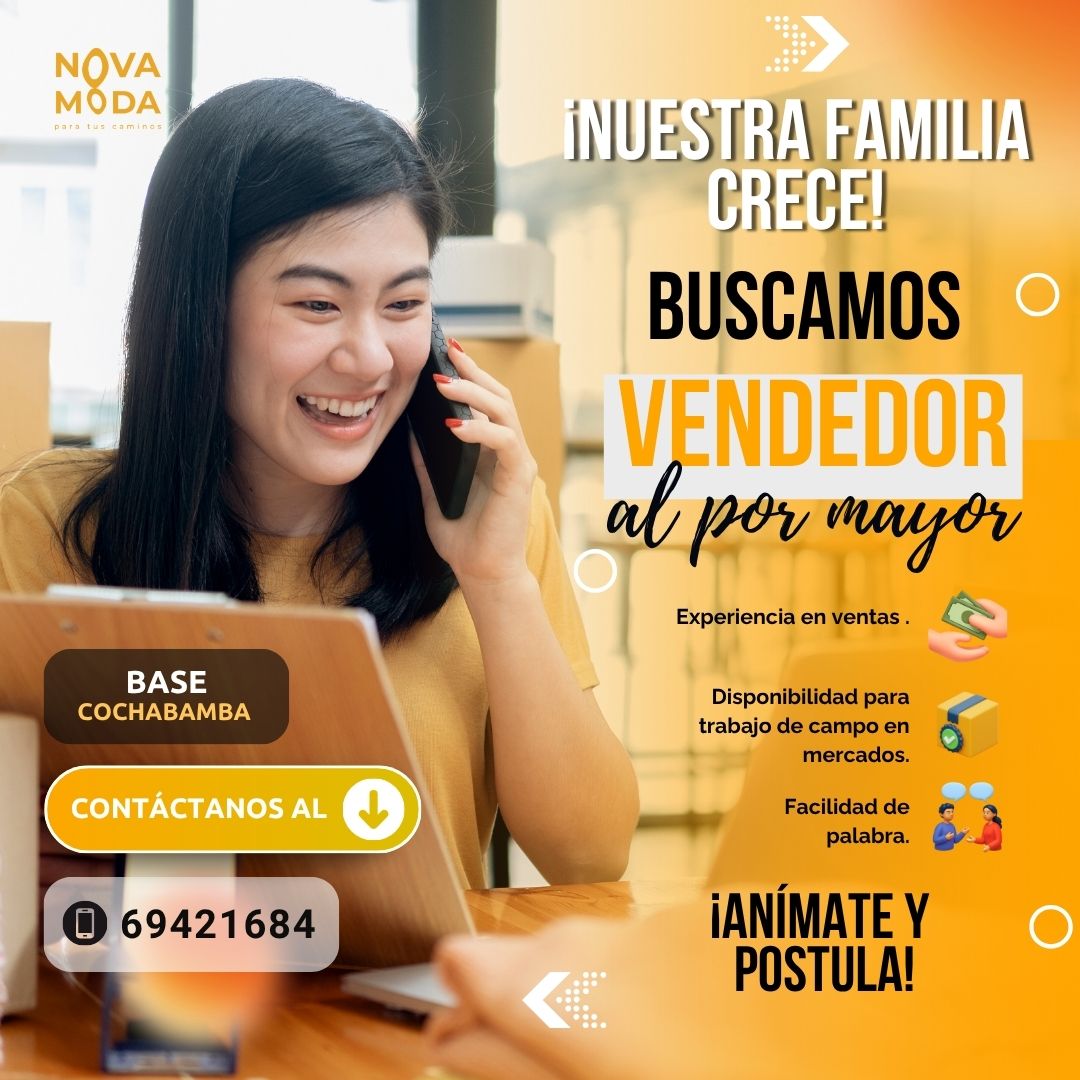 En Nova Moda, nuestra familia sigue creciendo y estamos en la búsqueda de un profesional con energía, ambición y pasión por las ventas para unirse a nuestro equipo en Cochabamba. Si eres una persona dinámica, con excelente capacidad de negociación y te apasiona el trabajo de campo, ¡esta es tu oportunidad!