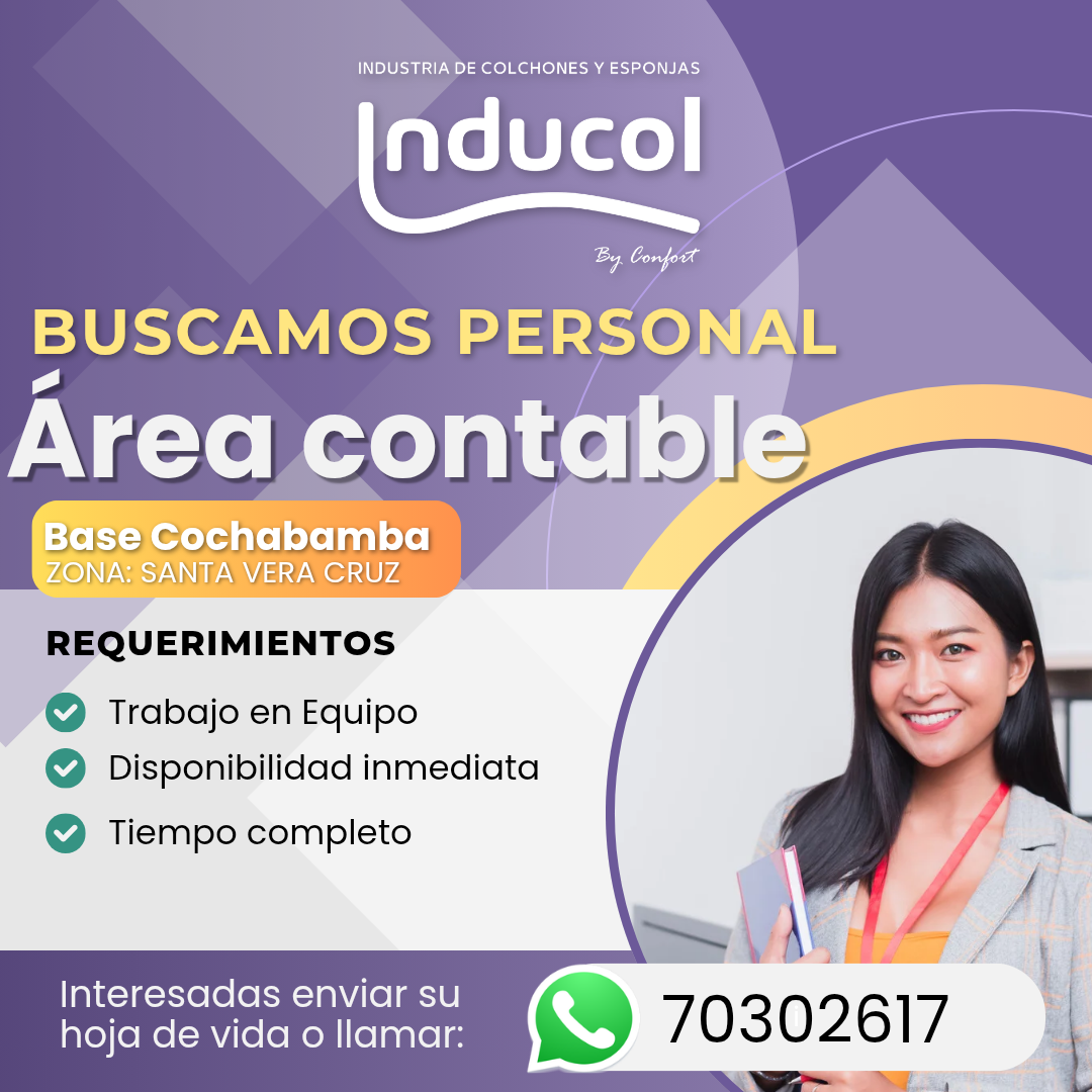👩💼 Únete al equipo InducolBuscamos Contadora con disponibilidad inmediata,manejo de Excel y ganas de crecer profesionalmente.📍 Base Cochabamba – Av. Petrolera📲 Postula enviando tu CV al 70302617