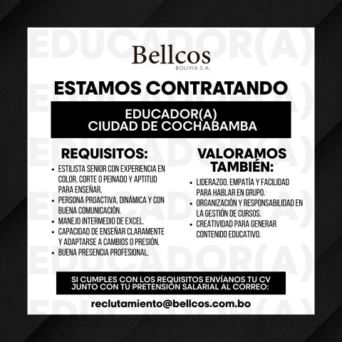 Si cumples con el perfil, envíanos tu CV junto con tu pretensión salarial al correo: reclutamiento@bellcos.com.bo