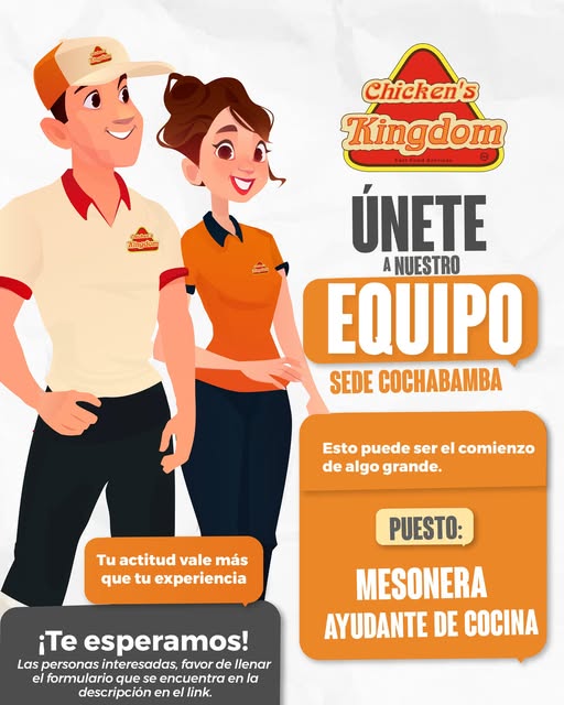 Estamos buscando MESONERAS Y AYUDANTES DE COCINA que sientan pasión por el buen trato, sean comprometidos y deseen unirse a la gran familia de Chicken's Kingdom en Cochabamba.