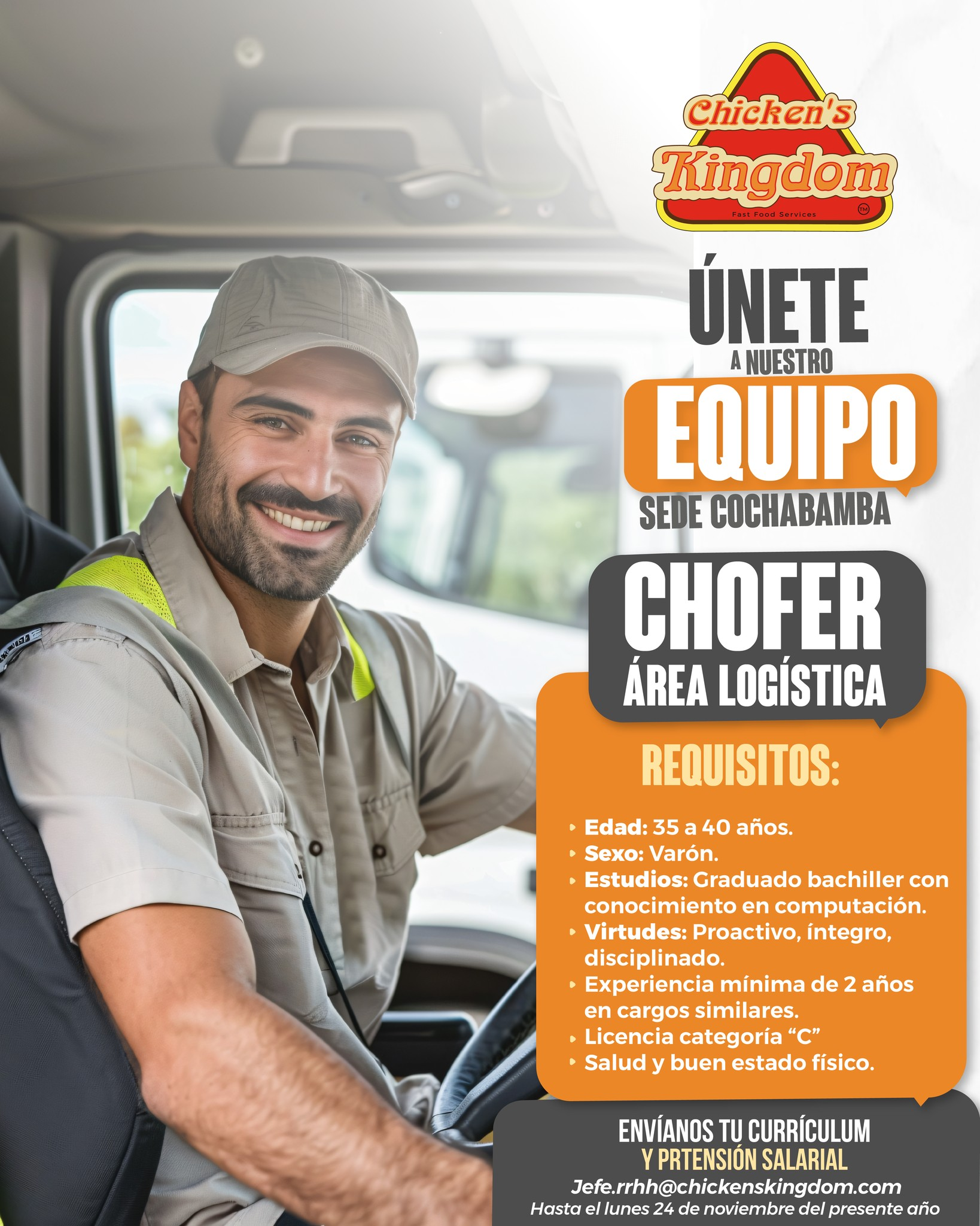 ¿Eres un conductor profesional y proactivo en busca de estabilidad? Chicken's Kingdom te está buscando para formar parte de nuestro equipo logístico en Cochabamba.