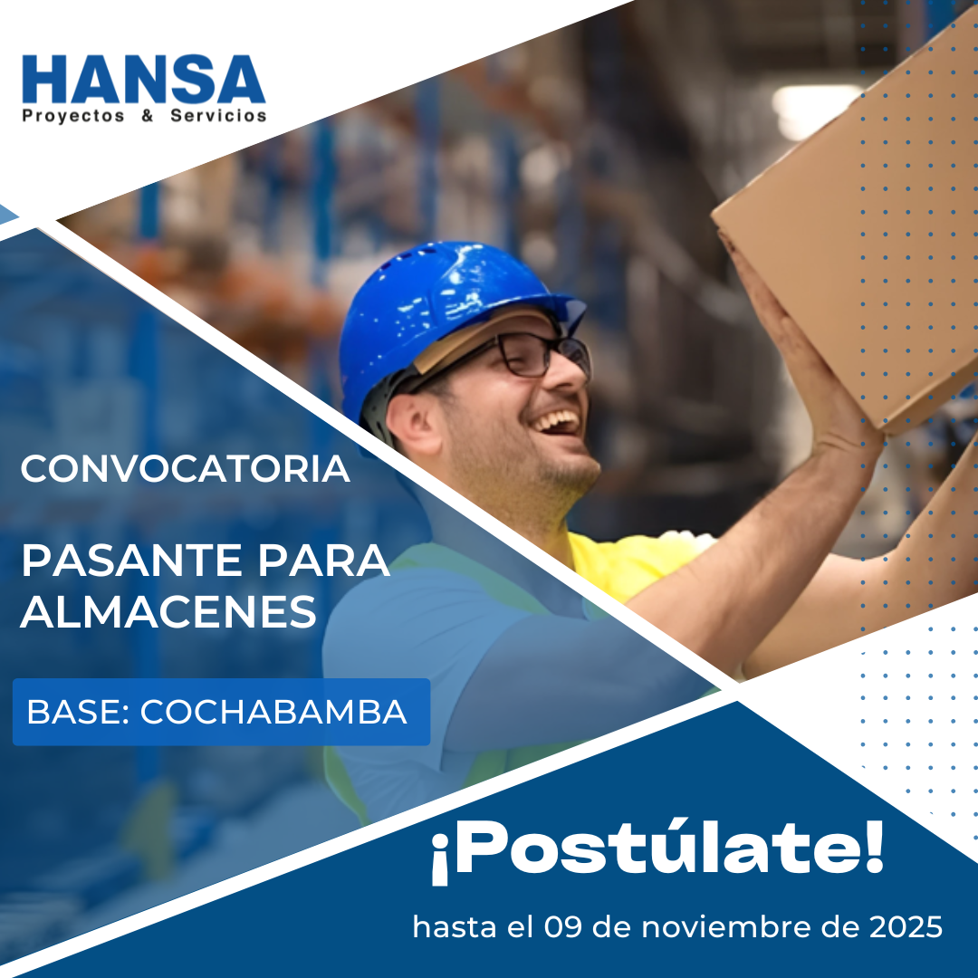 La División Proyectos & Servicios de HANSA Ltda. invita a estudiantes interesados en realizar una pasantía en el área de Almacenes, para apoyar las operaciones logísticas del rubro de telecomunicaciones, con base en la ciudad de Cochabamba.