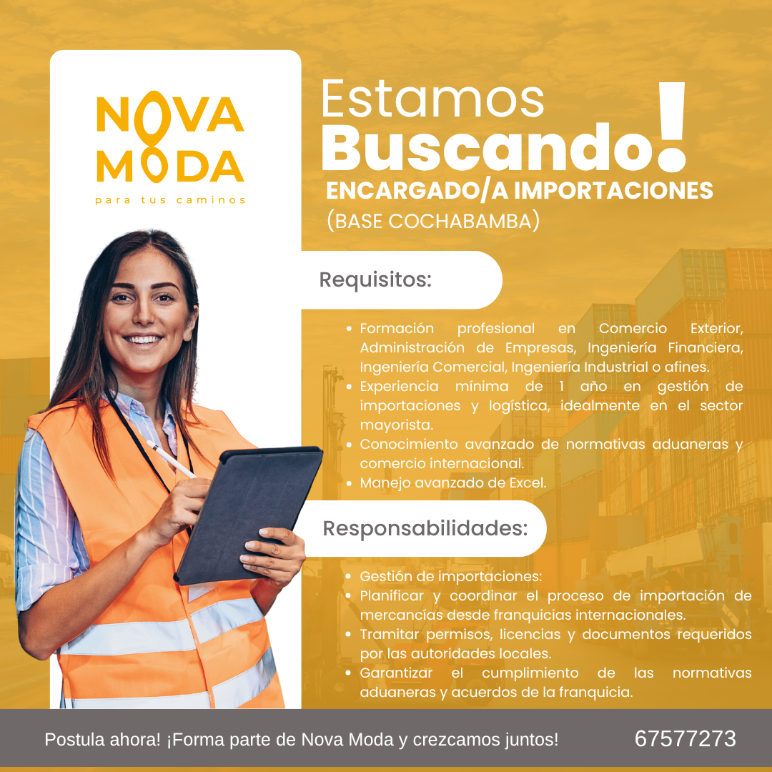 Nova Moda está en busca de un Encargado de Importaciones para gestionar y optimizar nuestros procesos logísticos internacionales. Si tienes experiencia en comercio exterior y un enfoque estratégico, ¡te estamos buscando!
