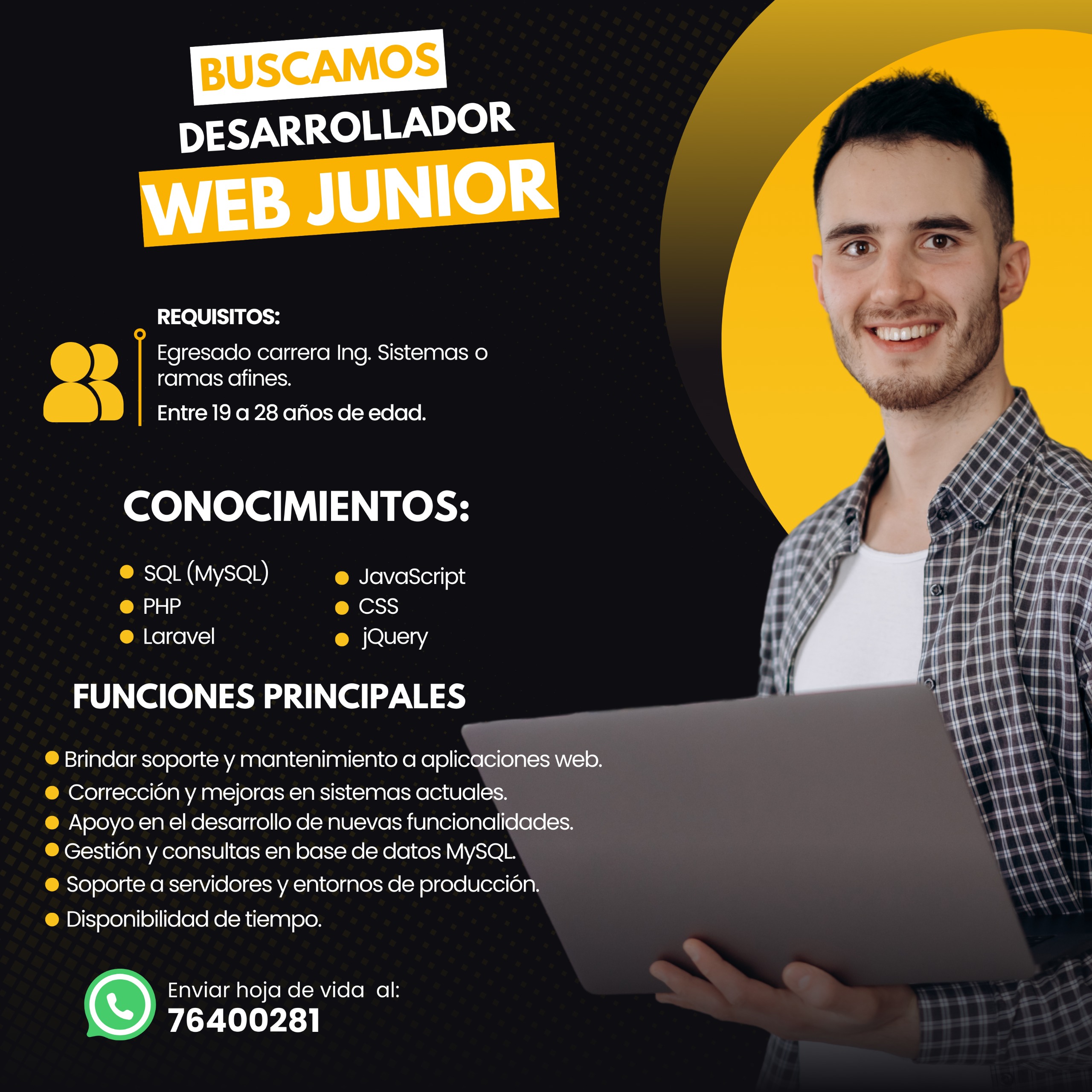 Buscamos un desarrollador web junior o recién egresado de la carrera de Ingeniería de Sistemas o carreras a fines, con interés en brindar soporte a aplicaciones web y desarrollarse profesionalmente en el área de tecnología. El candidato debe ser responsable, constante y buena disposición para aprender, capaz de apoyar en el conocimiento y mejora de sistemas existentes, trabajar en equipo y adaptarse a nuevos desafíos técnicos.