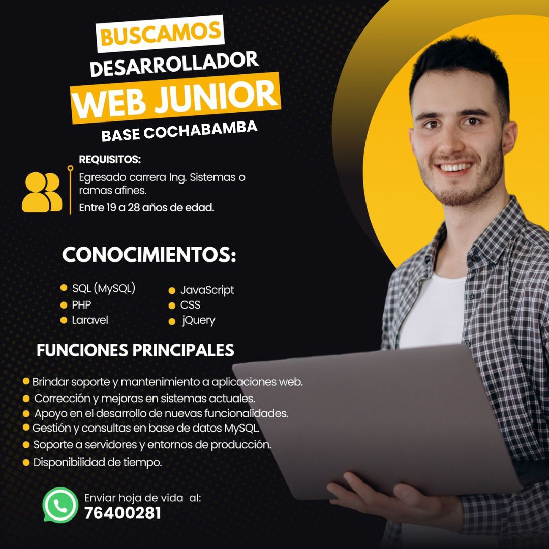 Buscamos un desarrollador web junior o recién egresado de la carrera de Ingeniería de Sistemas o carreras a fines, con interés en brindar soporte a aplicaciones web y desarrollarse profesionalmente en el área de tecnología. El candidato debe ser responsable, constante y buena disposición para aprender, capaz de apoyar en el conocimiento y mejora de sistemas existentes, trabajar en equipo y adaptarse a nuevos desafíos técnicos.