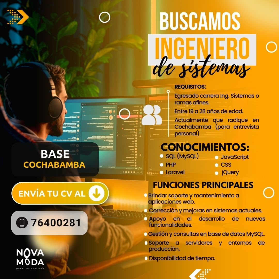 Buscamos un Ingeniero en Sistemas o recién egresado de la carrera de Ingeniería de Sistemas o carreras a fines, con interés en brindar soporte a aplicaciones web y desarrollarse profesionalmente en el área de tecnología. El candidato debe ser responsable, constante y buena disposición para aprender, capaz de apoyar en el conocimiento y mejora de sistemas existentes, trabajar en equipo y adaptarse a nuevos desafíos técnicos.
