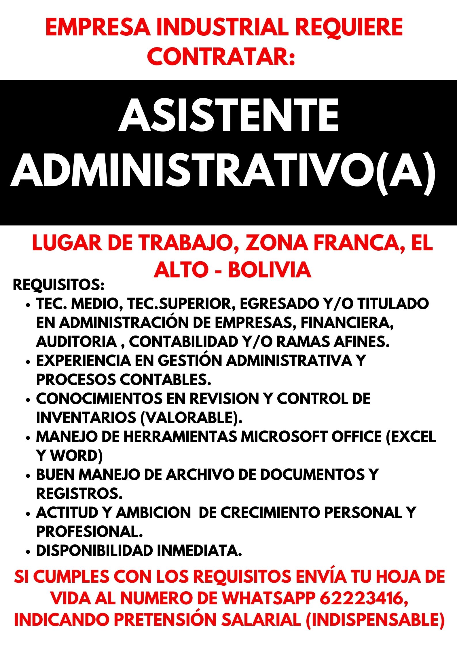 - Tec. Medio, Tec. Superior, Egresado y/o Titulado en Administración de empresas, Financiera, Auditoria , Contabilidad y/o ramas afines.