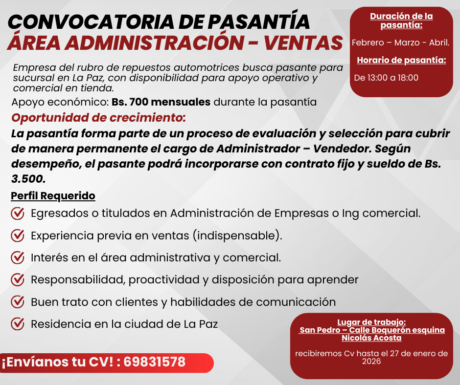 La pasantía forma parte de un proceso de evaluación y selección para cubrir de manera permanente el cargo de Administrador – Vendedor. Según desempeño, el pasante podrá incorporarse con contrato fijo y sueldo de Bs. 3.500.