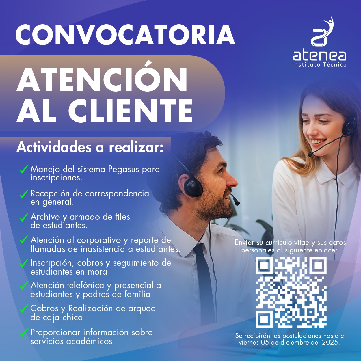 Convocatoria para el área de ATENCIÓN AL CLIENTE en el Instituto Atenea: