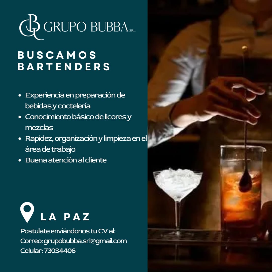 #GrupoBubba #LaPaz #TrabajoLaPaz #BuscoTrabajo #Bartender #Cocteleria #EmpleoBolivia