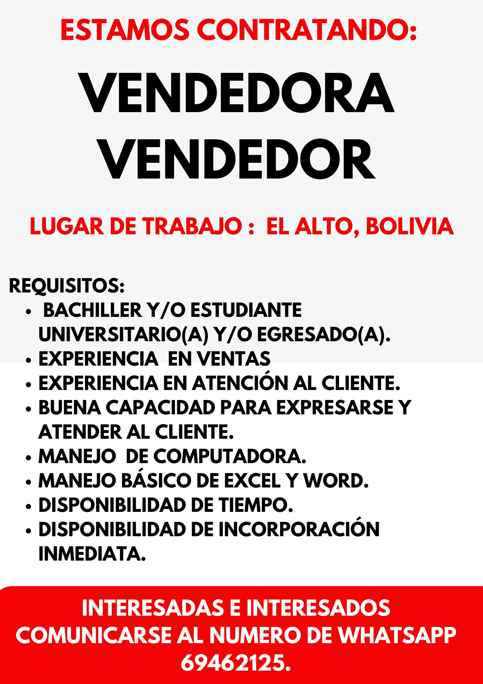 Interesadas e Interesados comunicarse al numero de WhatsApp 69462125.