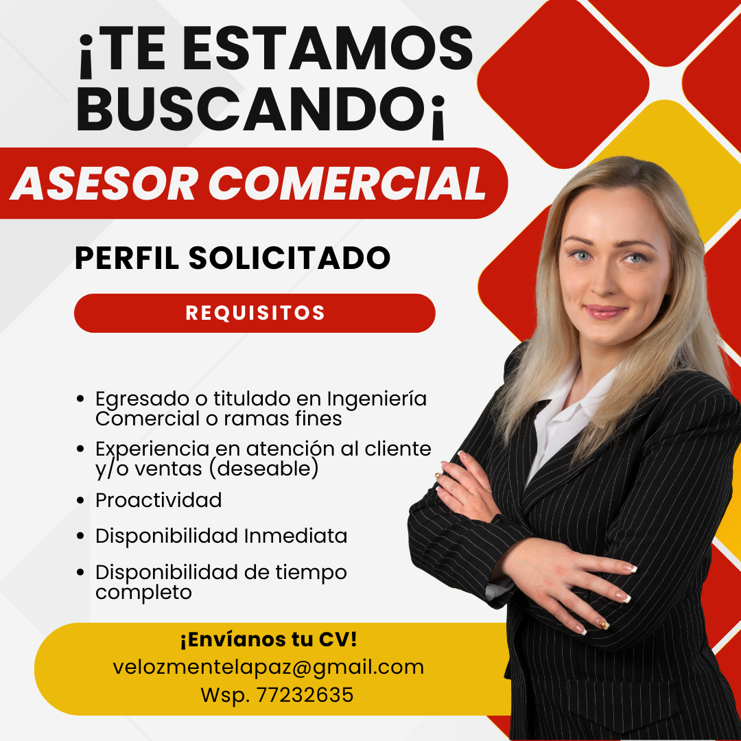 Estamos en búsqueda de un Asesor Comercial dinámico y motivado para formar parte de nuestro equipo. No requerimos experiencia previa, ¡lo más importante es tu actitud y ganas de aprender! 💪😃