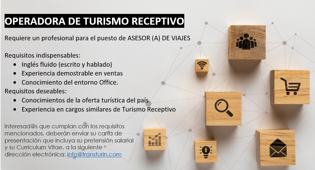 Interesad@s que cumplan con los requisitos mencionados, deberán enviar su carta de presentación que incluya su pretensión salarial y su Curriculum Vitae, a la siguiente dirección electrónica: info@transturin.com