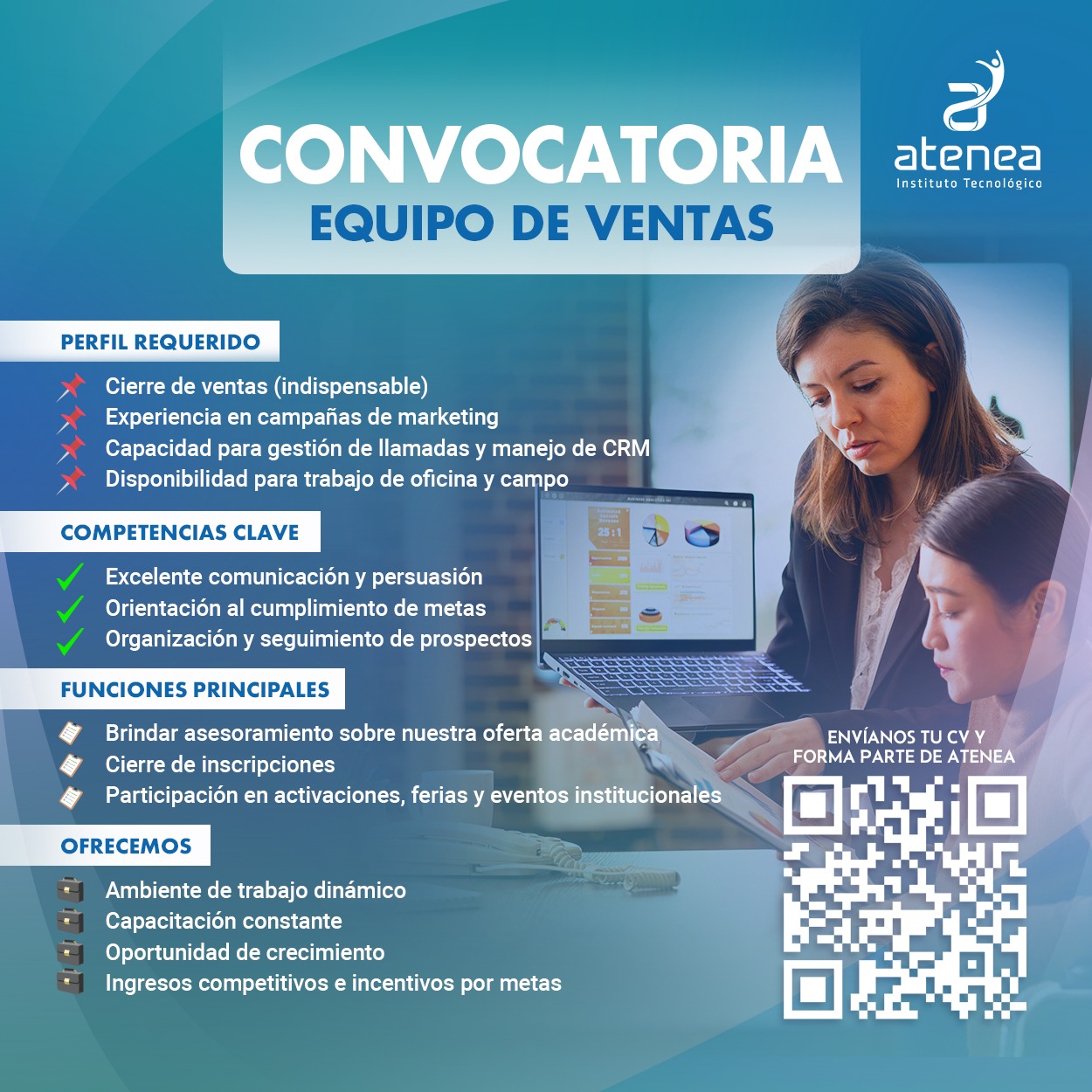 En el Instituto Técnico Atenea nos encontramos en la búsqueda de personas dinámicas, proactivas y orientadas a resultados para formar parte de nuestro equipo de ventas.