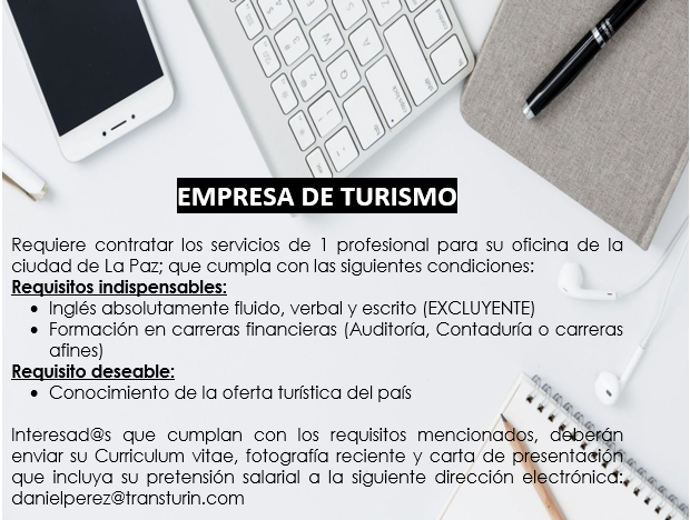 Requiere contratar los servicios de 1 profesional para su oficina de la ciudad de La Paz; que cumpla con las siguientes condiciones: