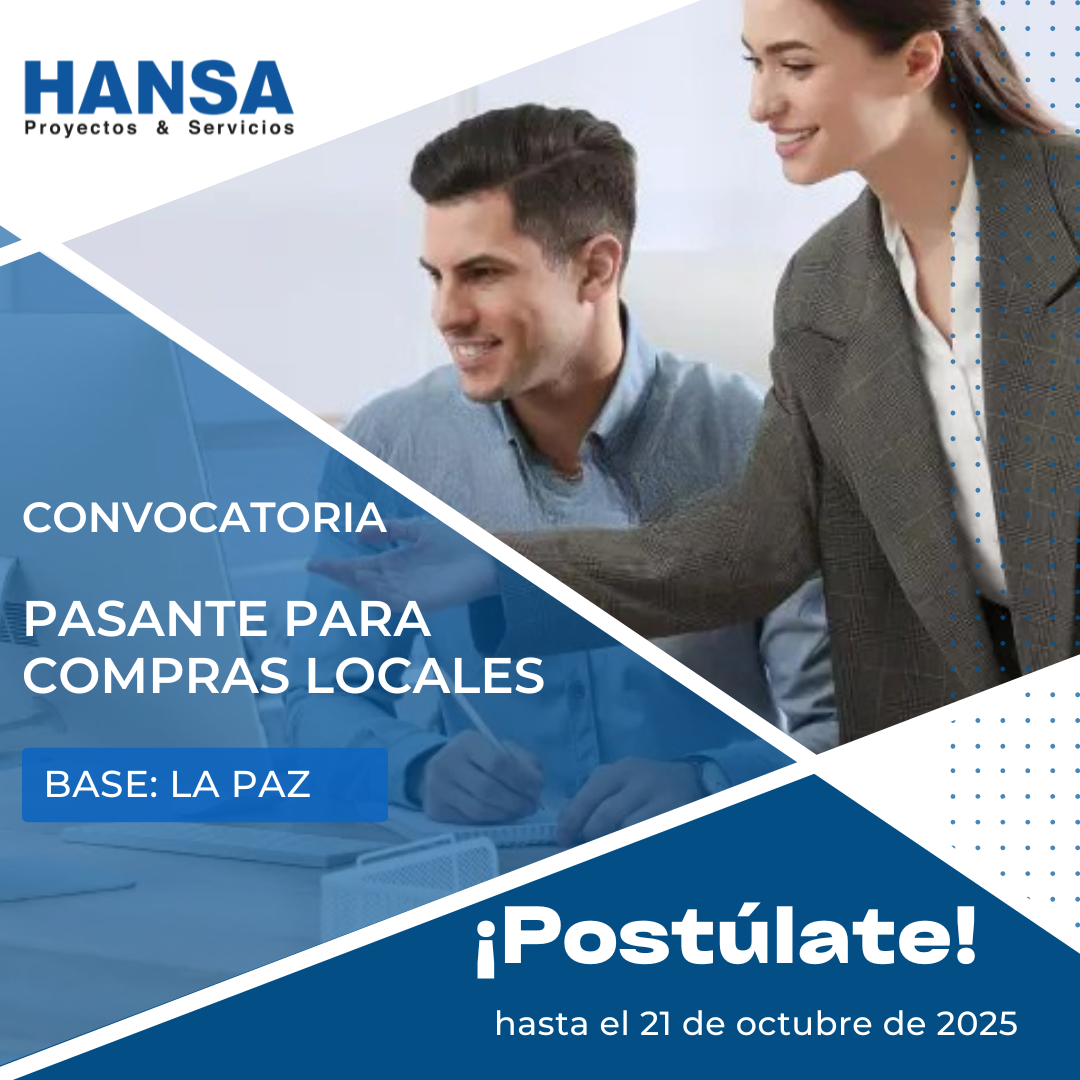 La División Proyectos & Servicios de HANSA LTDA. busca incorporar un Pasante para Compras Locales, con sede en la ciudad de La Paz.