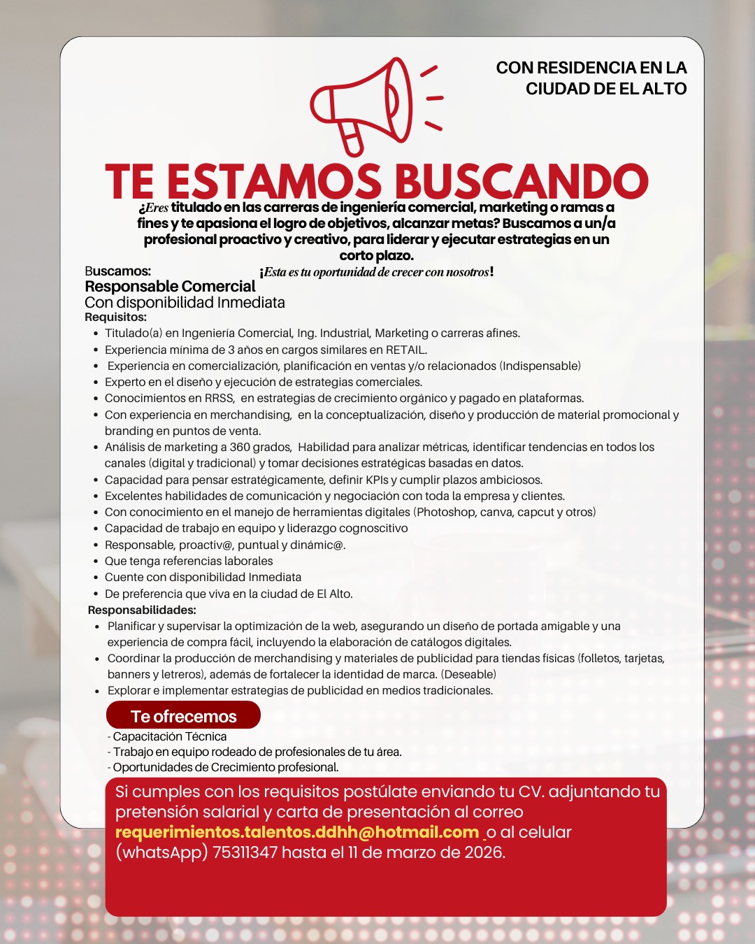 Si cumples con los requisitos postúlate llenando el siguiente formulario: https://forms.gle/zrQJ14RPPjcWJRxYA o escríbenos al WhatsApp: 75311347