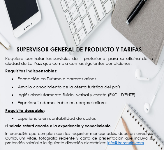 Interesad@s que cumplan con los requisitos mencionados, deberán enviar su Curriculum vitae, fotografía reciente y carta de presentación que incluya su pretensión salarial a la siguiente dirección electrónica: info@transturin.com