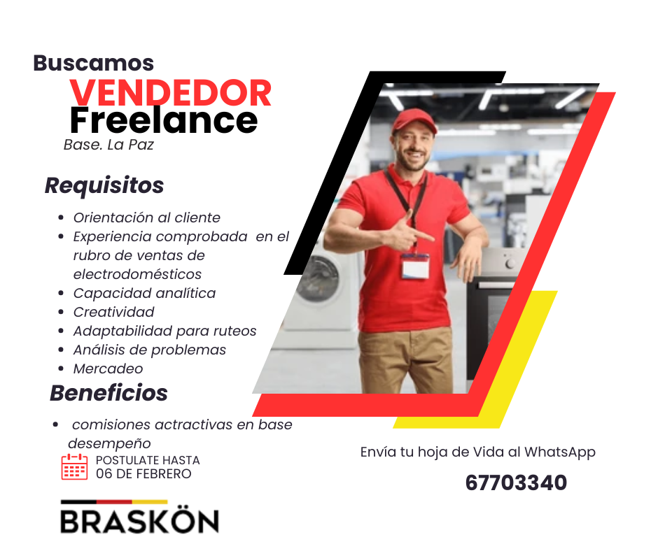 Empresa del rubro de electrodomésticos busca Vendedor Freelance para la ciudad de La Paz.