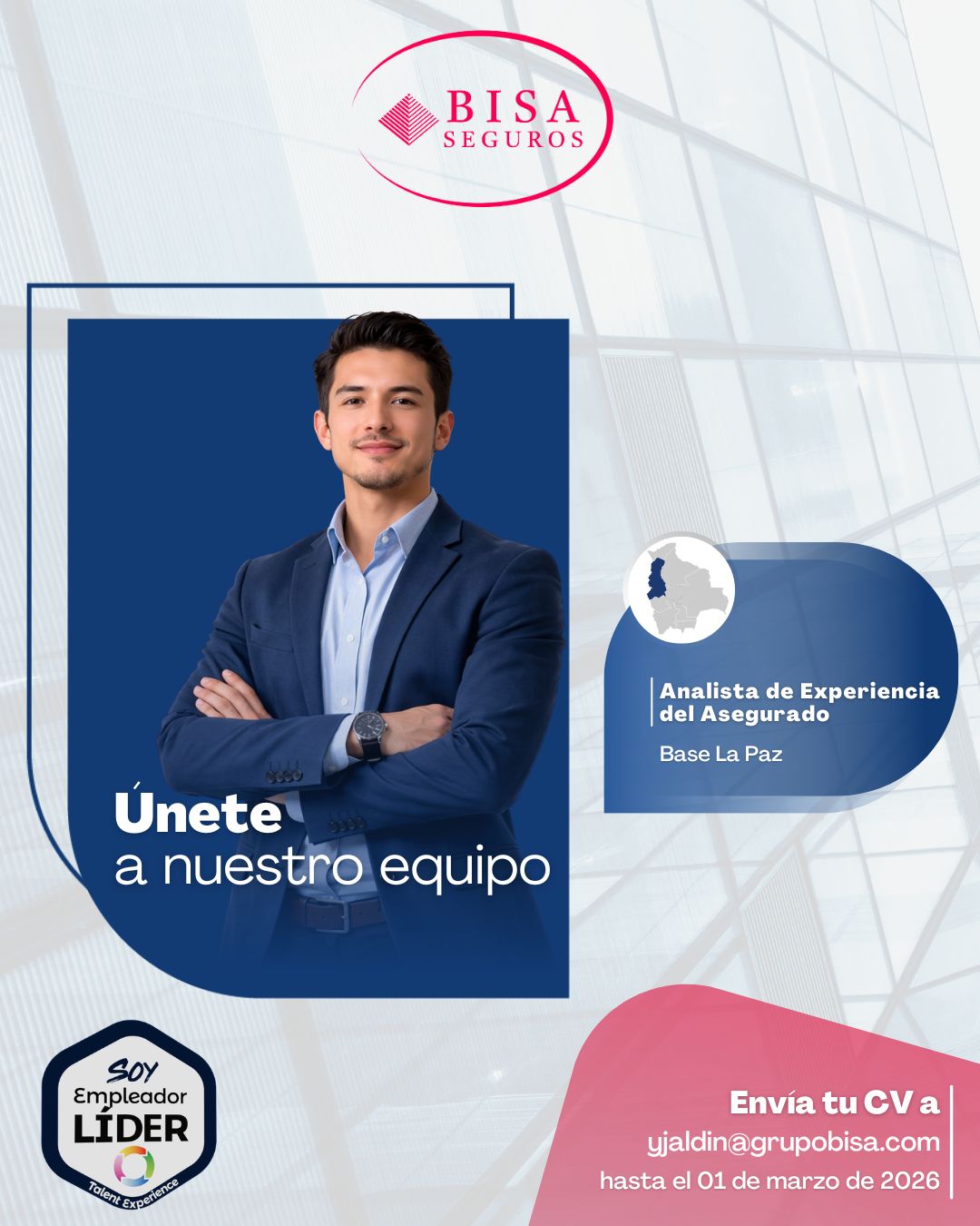 Envía tu Hoja de Vida al correo yjaldin@grupobisa.com con el asunto: “Analista de Experiencia del Asegurado”.