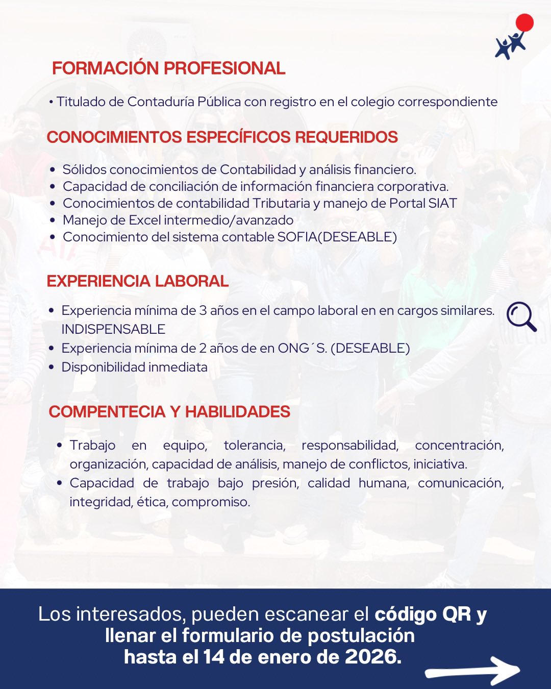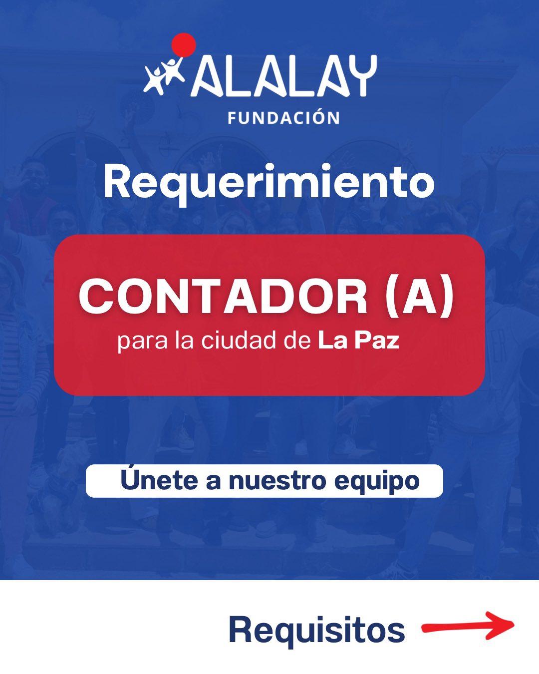 Descripción del empleo ¡Súmate a Fundación ALALAY! Buscamos CONTADOR/A para la ciudad de La Paz Postula escaneando el código QR Fecha límite: 14 de enero de 2026 Tu trabajo puede generar impacto social. ¡Te esperamos! Fuente https://www.facebook.com/FundacionAlalay/posts/pfbid02qx4w1zKReQQF4ZEeYT1EbFzKf…