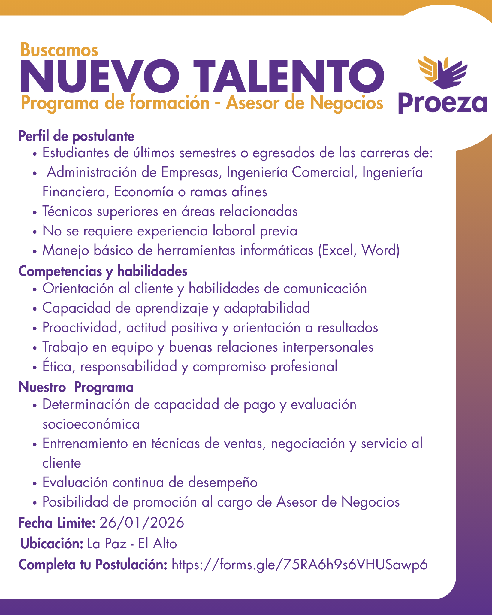 Nuevo Talento Proeza – Formación para Asesor de Negocios (El Alto)