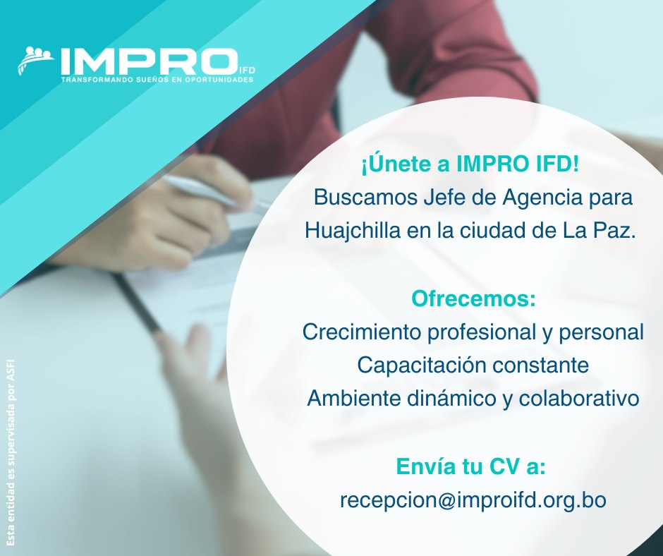 IMPRO IFD invita a profesionales con experiencia en liderazgo y gestión financiera a postularse y formar parte de su equipo de trabajo en la ciudad de La Paz.