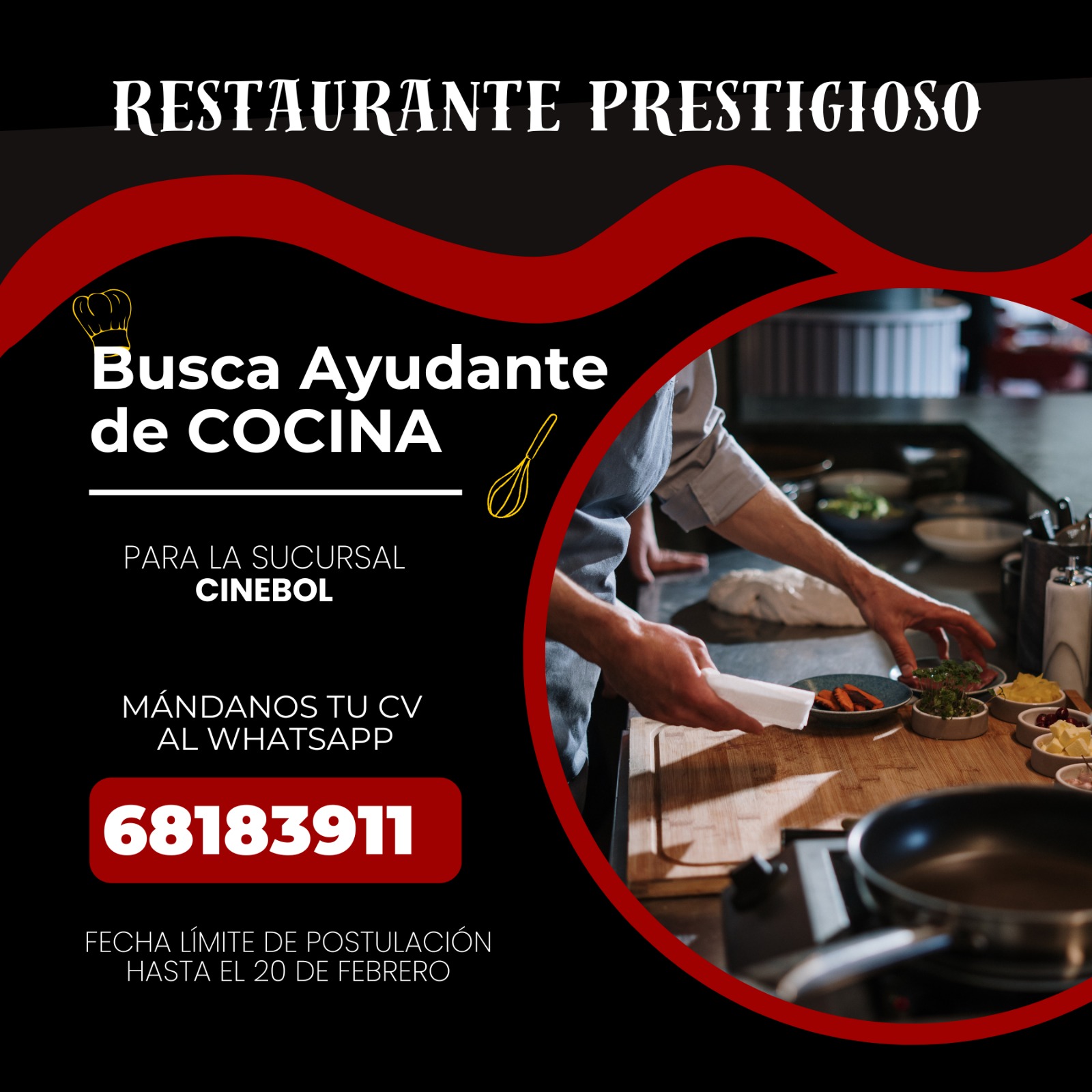 Estamos en la búsqueda de un Ayudante de Cocina con experiencia para nuestra sucursal en Cinebol. Si eres apasionado, puntual y buscas un reto a tiempo completo, ¡esta es tu oportunidad!