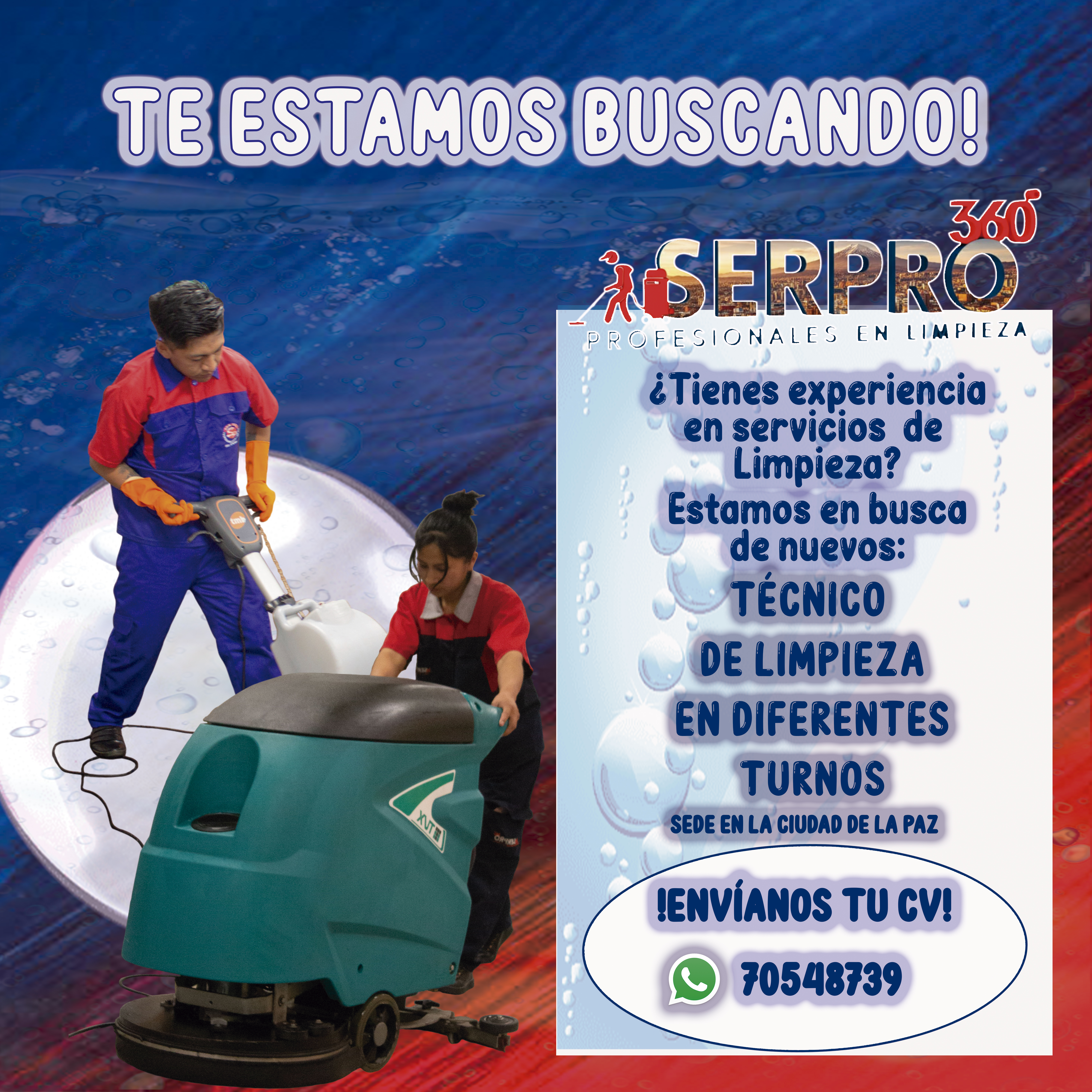 ¿Tienes experiencia en servicios de Limpieza?Estamos en busca de nuevos:TÉCNICO DE LIMPIEZA EN DIFERENTES TURNOS.SEDE EN LA CIUDAD DE LA PAZ.!ENVÍANOS TU CV! WHATSAPP: 70548739