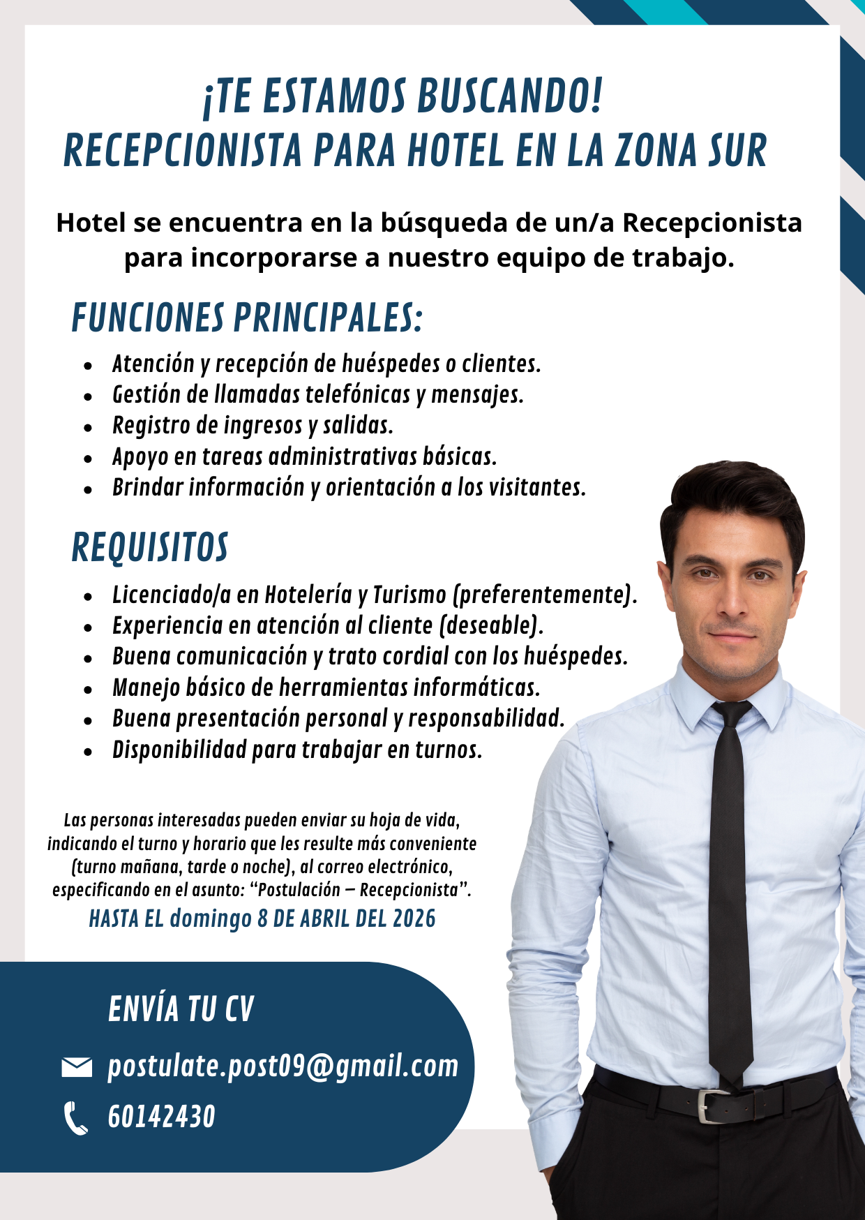 Se requiere recepcionista para hotel en la zona Sur de La Paz, responsable de la atención y registro de huéspedes (check-in y check-out), manejo de reservas, atención telefónica y presencial, coordinación con áreas internas y apoyo administrativo, brindando un servicio cordial y eficiente; deberá manejar sistemas básicos, resolver consultas, reportar novedades y mantener una actitud proactiva, organizada y orientada al cliente.