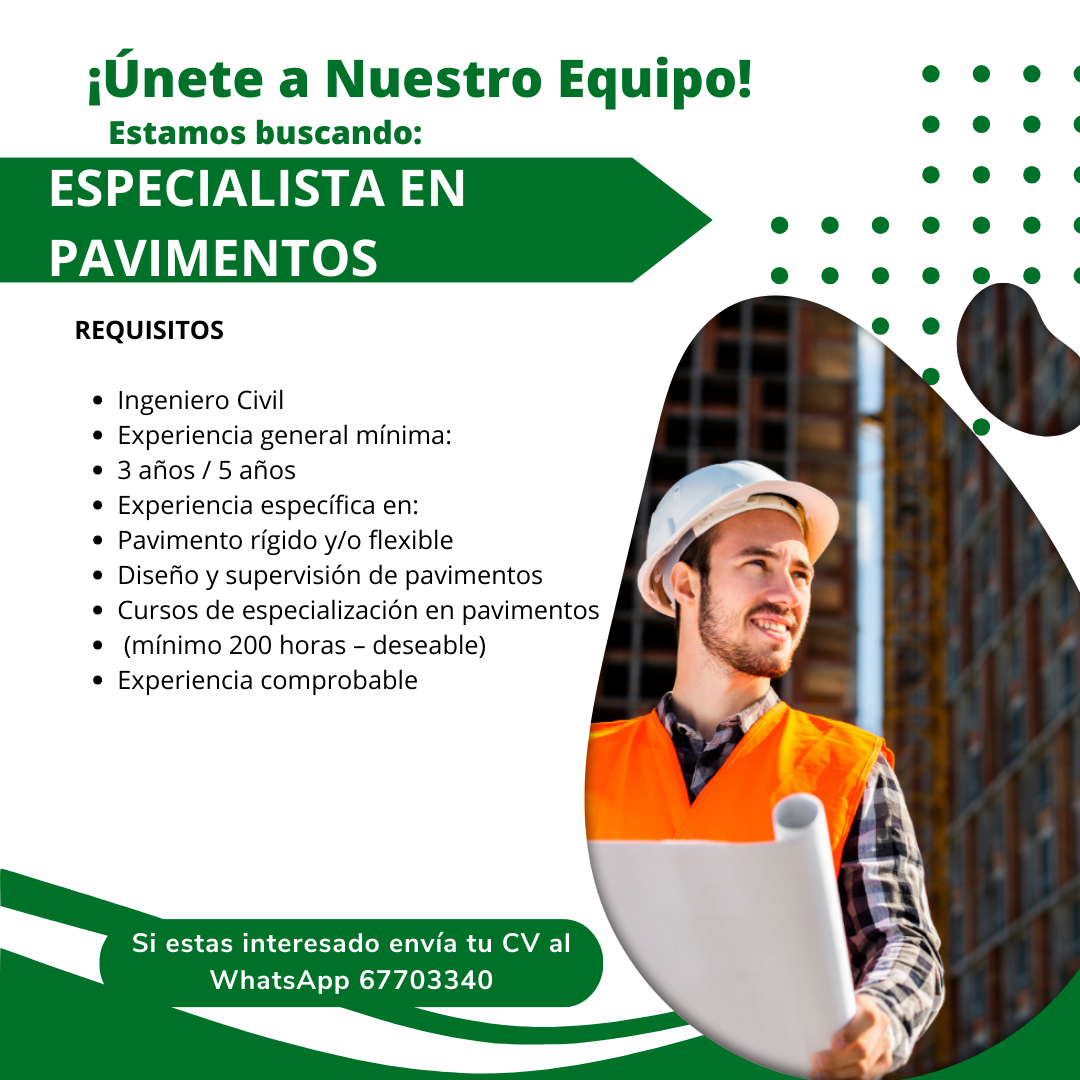 El cargo requiere experiencia en pavimentos rígidos y/o flexibles, control de calidad y supervisión en obra, con disponibilidad para viajes y trabajo por turnos, orientado/a al cumplimiento de normativa y resultados técnicos.