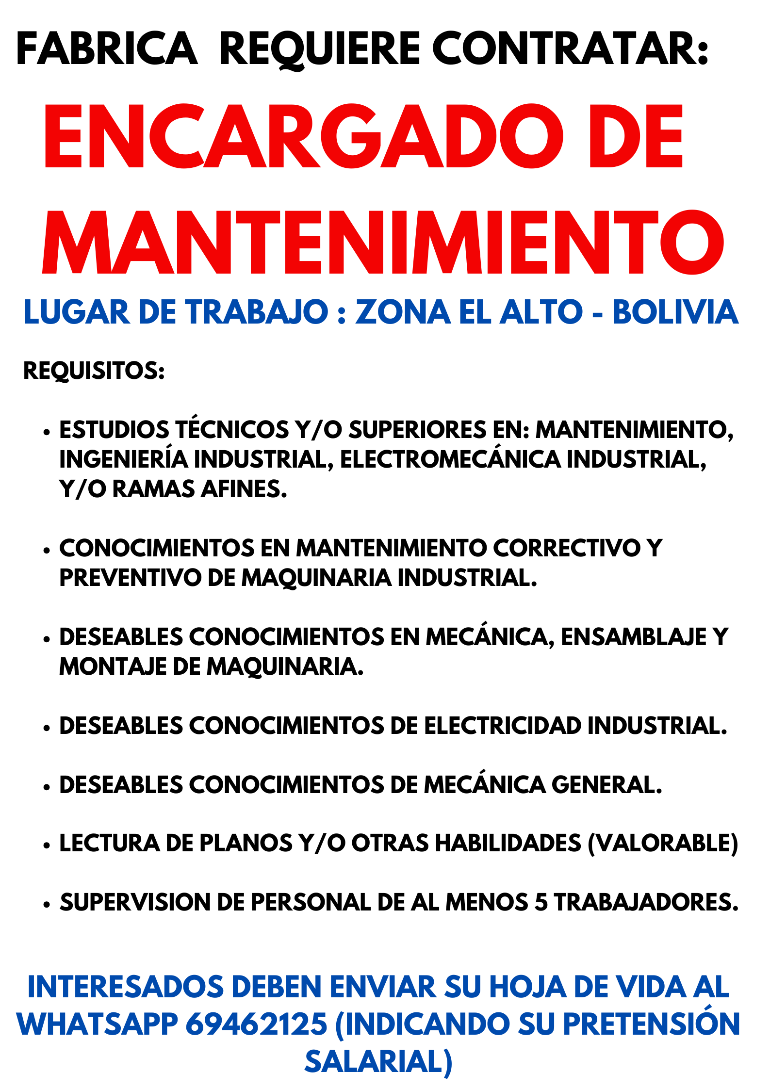 - Estudios Técnicos y/o superiores en: Mantenimiento, Ingeniería Industrial, Electromecánica Industrial, y/o ramas afines.