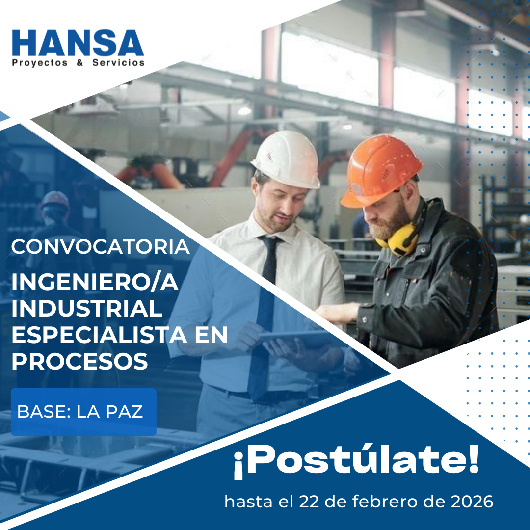 La División Proyectos & Servicios de HANSA LTDA. busca incorporar a su equipo un/a Ingeniero/a Industrial con especialidad en Procesos Base: La Paz, orientado/a a la mejora continua y optimización operativa.