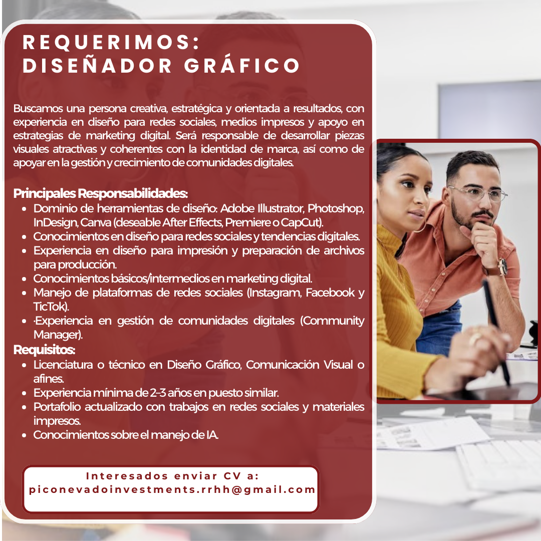 Enviar CV y portafolio al correo: piconevadoinvestments.rrhh@gmail.com