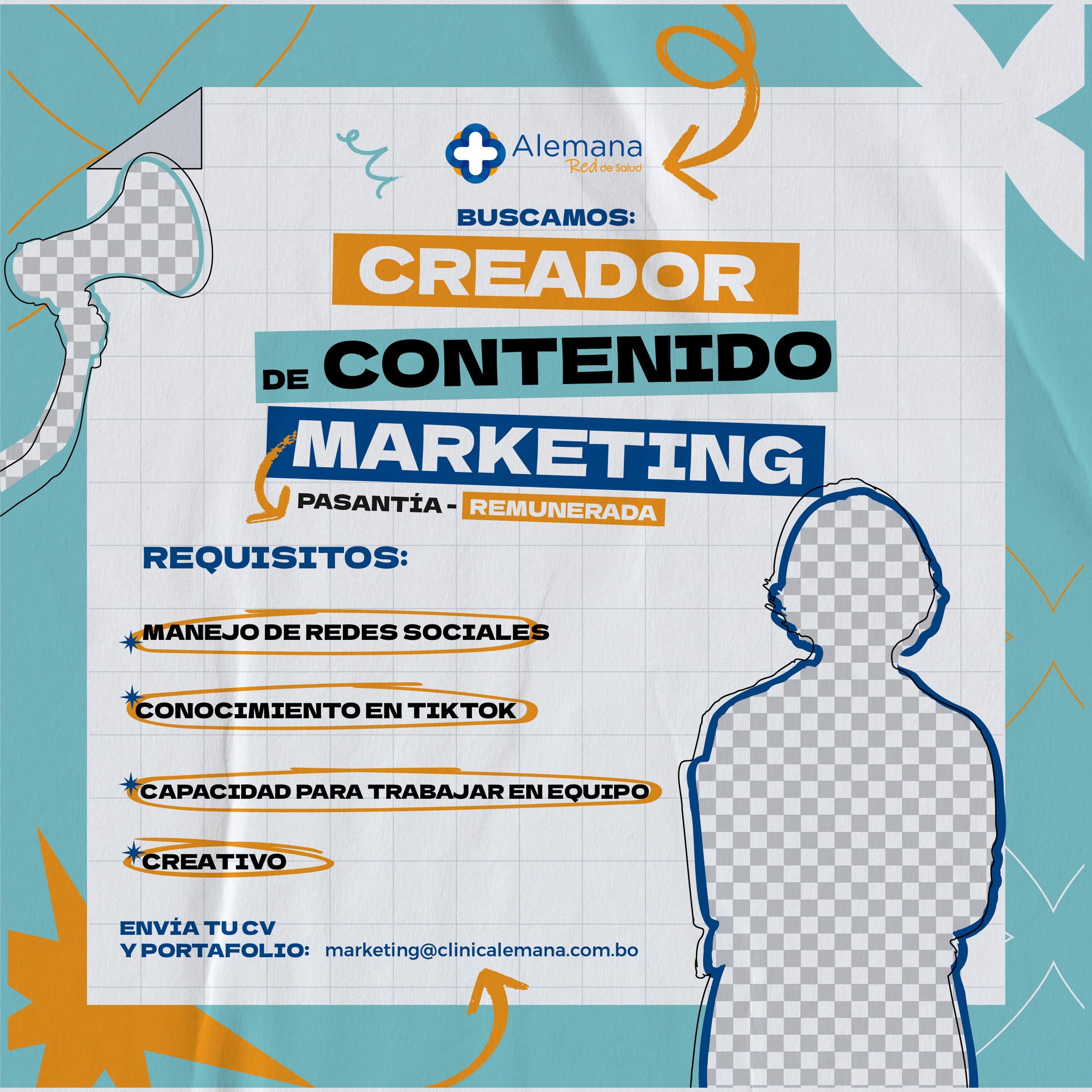 Postula hasta el miércoles 8 de octubre enviando tu CV y portafolio o trabajos que hayas realizado a: marketing@clinicalemana.com.bo